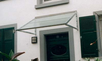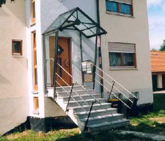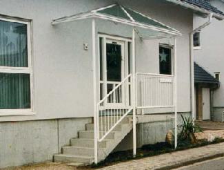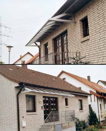 Vordach mit Geländer aus Stahl, feuerverzinkt und weiß lackiert ![]() Pultdach aus Stahlrohr, feuerverzinkt ![]() | Vordach mit Windfang und Geländer aus Stahl, feuerverzinkt und lackiert. Handlauf und Füllstäbe aus Edelstahl ![]() Vordach aus Aluminium, lackiert ![]() |